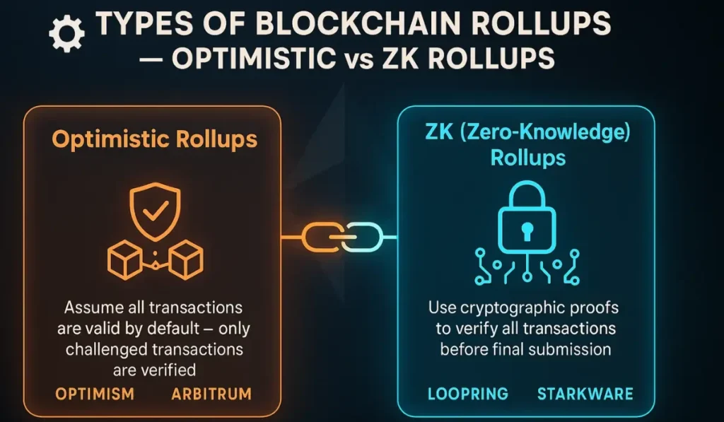 - Optimistic rollups: how optimistic rollups work is by assuming all transactions created are valid by default, unless someone makes a dispute. If no one challenges the validity of the transaction, then they are considered valid and approved. Examples include optimism and Arbitrum.
