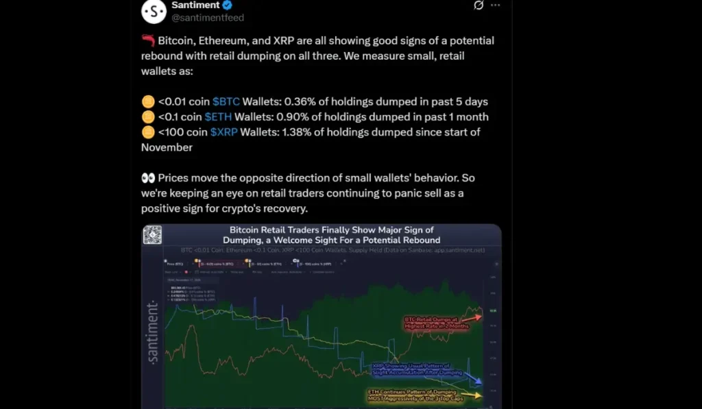 The ETF optimism, dip buying, and the crypto-friendly legislation are some fueling factors for XRP, along with the progress on the United States Market Structure Bill. The broader cryptocurrency market exhibited a short-term bullish sentiment on Wednesday, with prominent coins BTC and ETH demonstrating a price increase of 1.7% and 2.5% respectively. Market intelligence platform Santiment reported that Bitcoin, Ethereum, and XRP were all showing good signs of a potential rebound, with retail dumping on all three. They measured small, retail wallets as: <0.01 coin $BTC Wallets: 0.36% of holdings dumped in the past 5 days, <0.1 coin $ETH Wallets: 0.90% of holdings dumped in the past 1 month, <100 coin $XRP Wallets: 1.38% of holdings dumped since the start of November. They noted that prices move in the opposite direction of small wallets’ behavior and mentioned that they were keeping an eye on retail traders continuing to panic sell as a positive sign for crypto’s recovery.