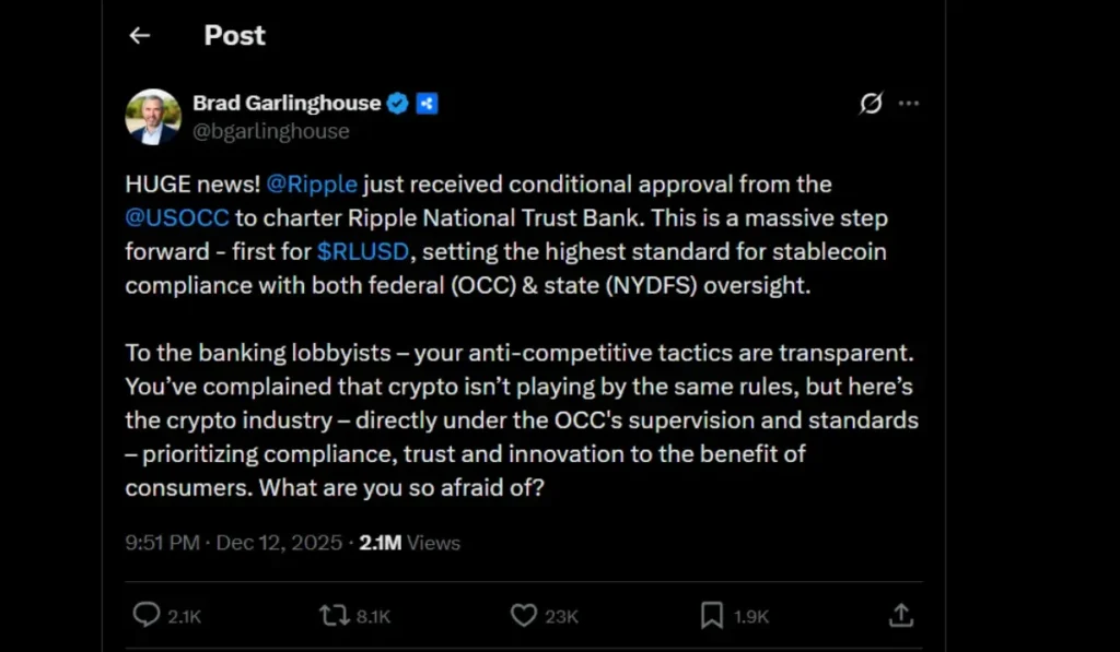 Ripple CEO Brad Garlinghouse said that the company’s conditional approval from the US Office of the Comptroller of the Currency (OCC) to charter Ripple National Trust Bank marked a major milestone. He emphasized that the move set the highest standard for stablecoin compliance under both federal and state oversight, specifically citing the OCC and NYDFS. Garlinghouse added that, despite criticism from banking lobbyists, Ripple was demonstrating that the crypto industry could operate directly under regulatory supervision, prioritizing compliance, trust, and innovation for the benefit of consumers.